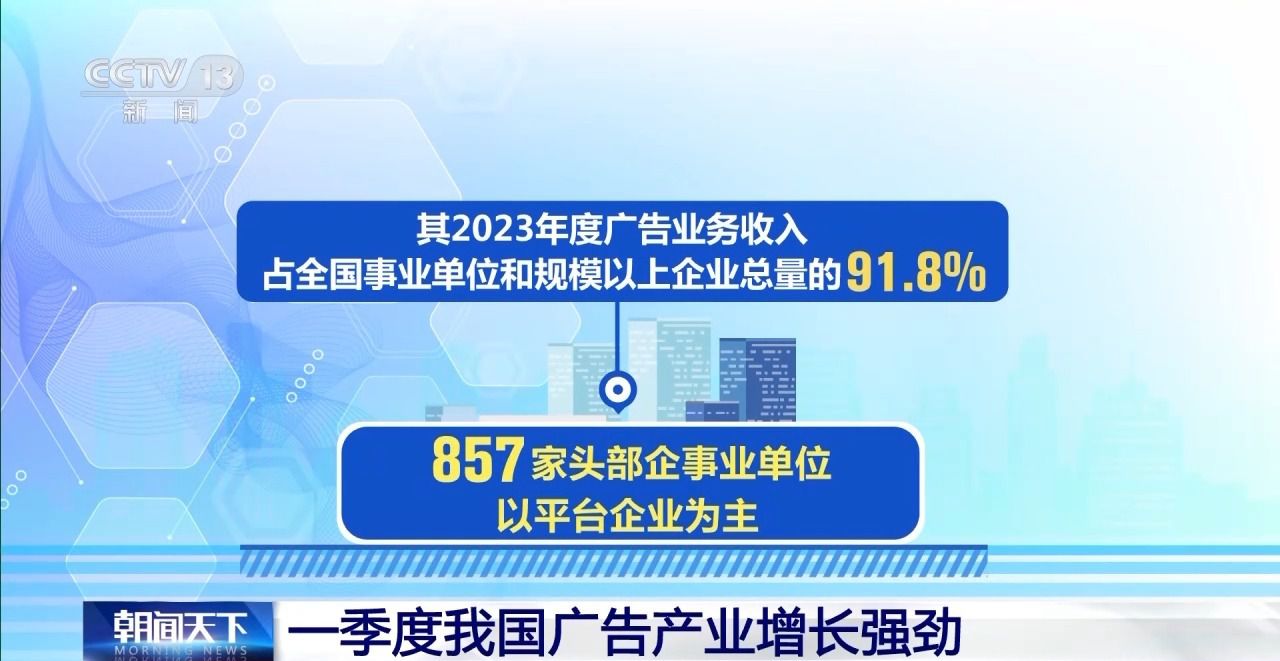 市场监管总局公布数据显示,一季度857家头部企事业单位共实现广告业务收入2740.6亿元,同比增长13.6%。